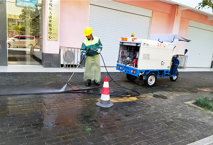 为进一步提高道路清扫保洁质量,洗扫车沿着主干道来回作业,由洒水车将路面的落叶冲刷到道路两边,最后由环卫工人将道路两侧和马路牙子旁的树叶进行人工清扫。高压冲洗车紧随其后,将落叶集中冲刷至道路一侧,大大缩小了落叶的散落范围,为后续收集工作提供了便利。